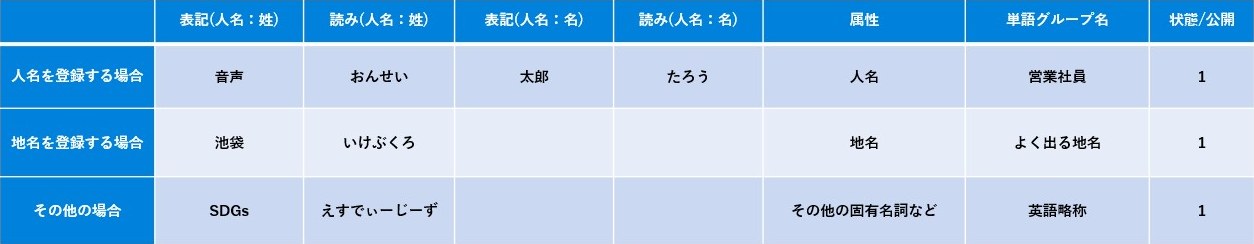 | 読み(人名:姓) | 属性が人名の場合:「音声 太郎」の場合、「おんせい」 属性が地名の場合:「池袋」の場合、「いけぶくろ」 その他固有名詞などの場合:「SDGs」の場合、「えすでぃーじーず」 |