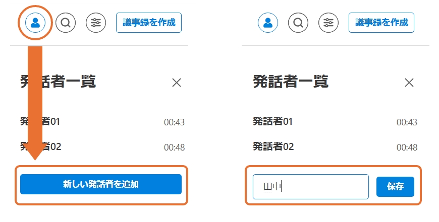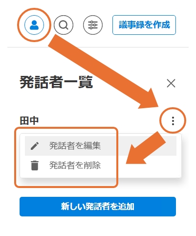 メニューバーの発話者一覧から、発話者名の追加・編集・削除が可能です。