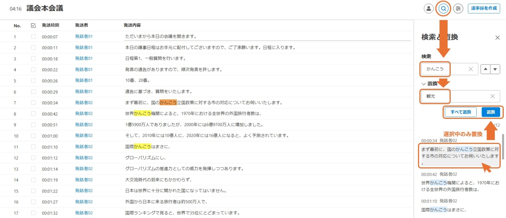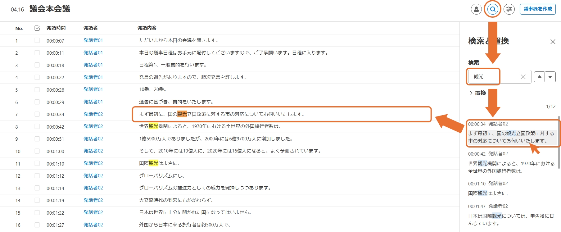 また、検索結果をクリックすると当該の発話内容にジャンプすることができます。