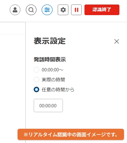 発話時間の表示を「00:00:00~」「実際の時間」「任意の時間から」より選択して変更できます。