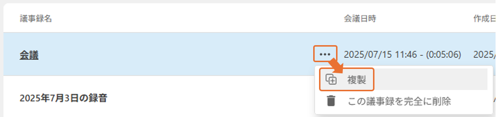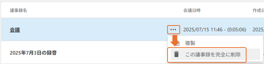 議事録データにカーソルを合わせると右側に出てくる「…」から、「この議事録を完全に削除」を押すとデータの手動削除が可能です。