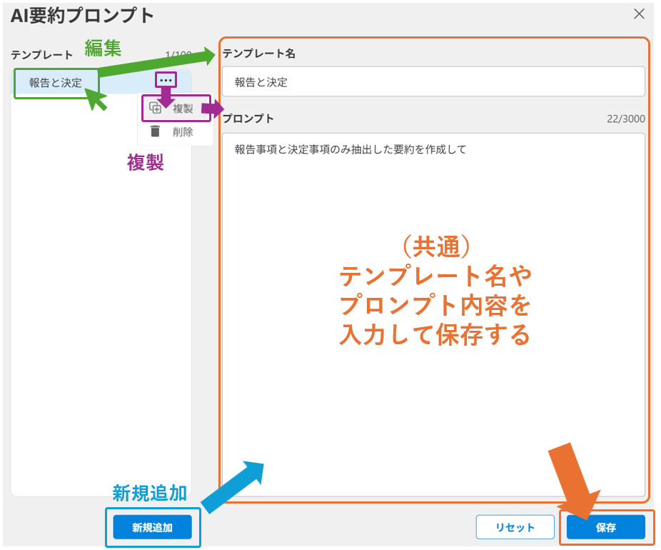 リセットボタンを押すと、テンプレート名とプロンプト内容を保存前の状態まで戻せます。