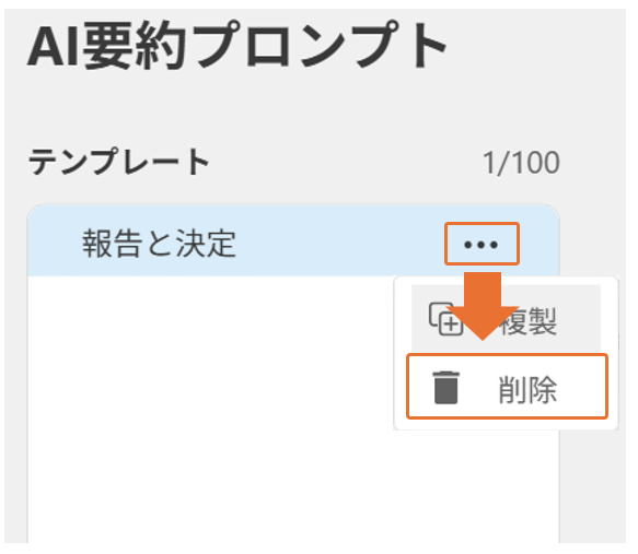 AI要約機能のカスタムフォーマットではプロンプト(命令文)を自由に入力して要約を実行できますが、その際に利用するプロンプトをテンプレート保存しておくことが可能です。一度作成すれば詳細な指示を都度入力する必要がないため、登録して利用するのがオススメです。