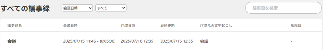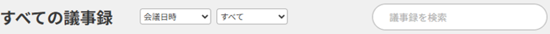 議事録データを、会議日時・作成日時・最終更新で絞り込んだり、議事録名や作成元の文字起こし名で検索できます。