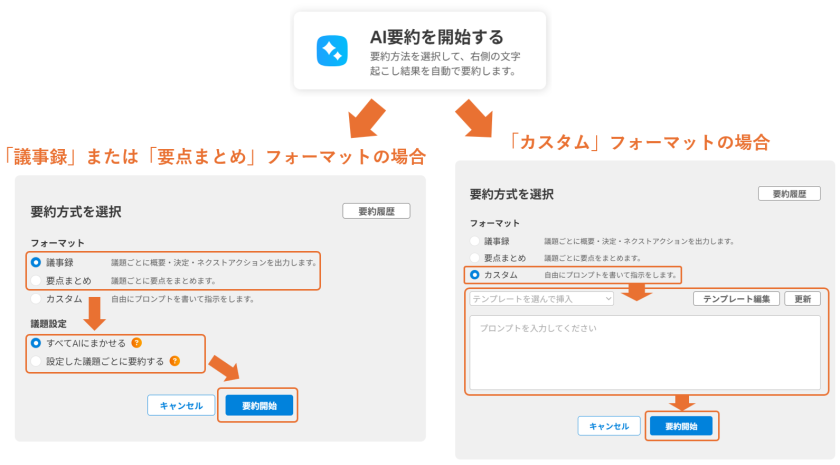 - フォーマットで「カスタム」を選択した場合、要約元のハイライト機能は利用不可となります。