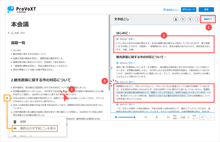 ※編集の際は音声再生メニューをご活用ください - 要約結果をクリックすると要約元の文字起こし結果をハイライトします。
