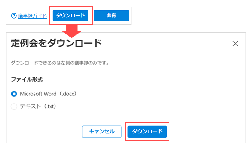 「ダウンロード」ボタンから、Wordまたはテキスト形式で出力可能です。