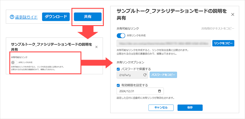 URL共有後に議事録エディタ画面で修正した内容も反映され、同じ共有リンクから確認可能です。