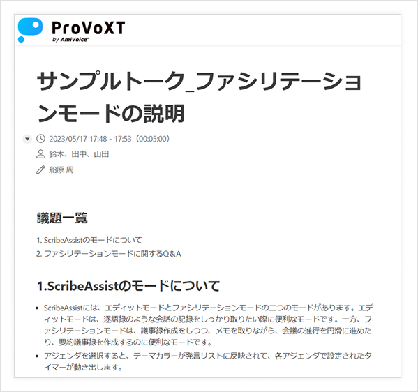 会議タイトル、会議の詳細情報、議事録エリアで編集した議事録の内容が出力されます。