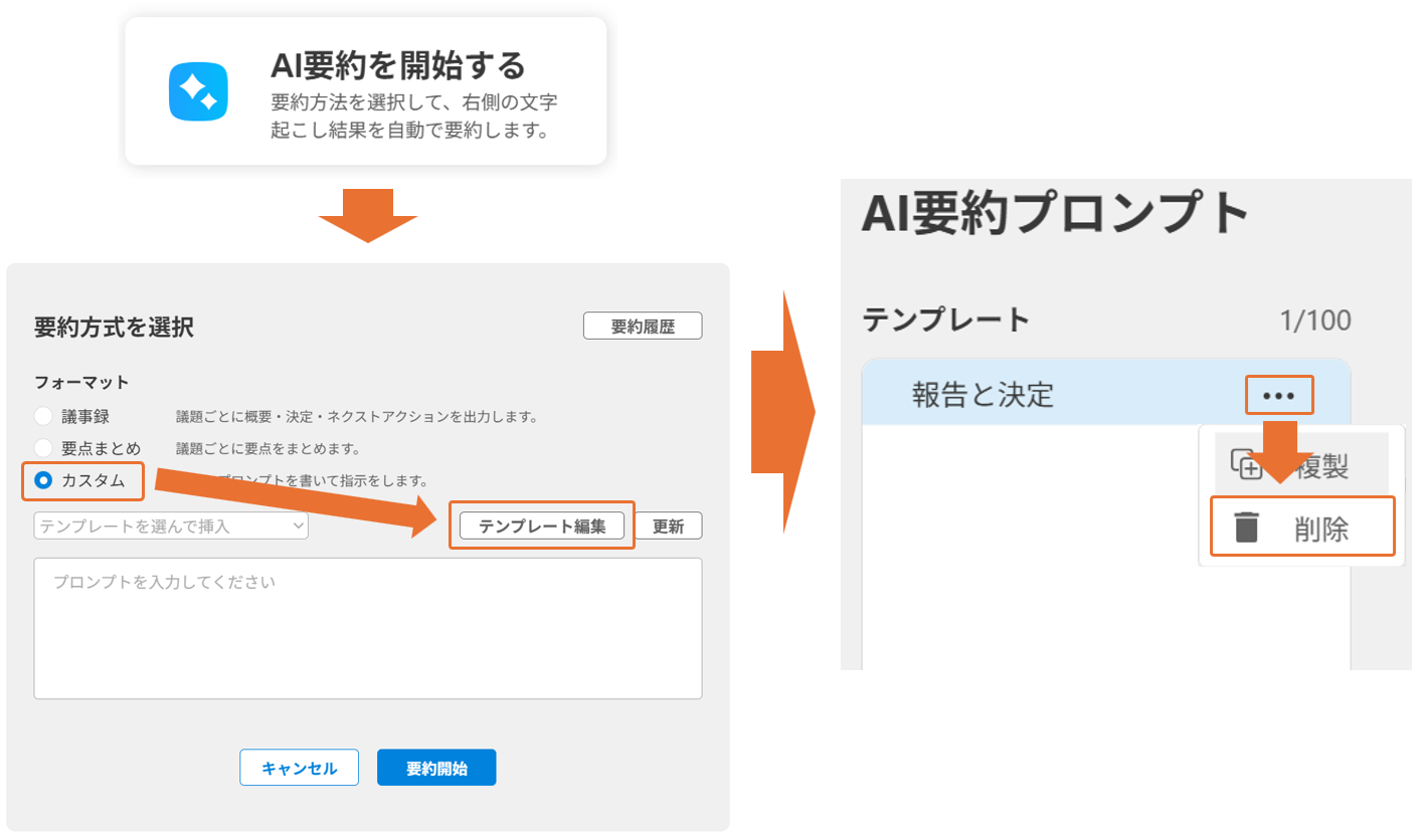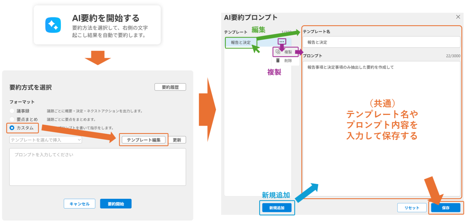 AI要約機能のカスタムフォーマットではプロンプト(命令文)を自由に入力して要約を実行できますが、その際に利用するプロンプトをテンプレート保存しておくことが可能です。一度作成すれば詳細な指示を都度入力する必要がないため、登録して利用するのがオススメです。