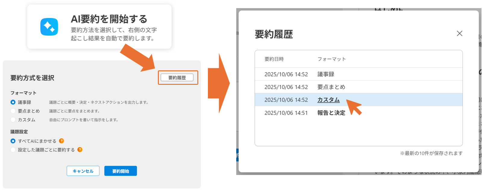 AI要約に利用したフォーマットの履歴を確認できます。履歴は議事録データごとに、最新の10件が保存されます。