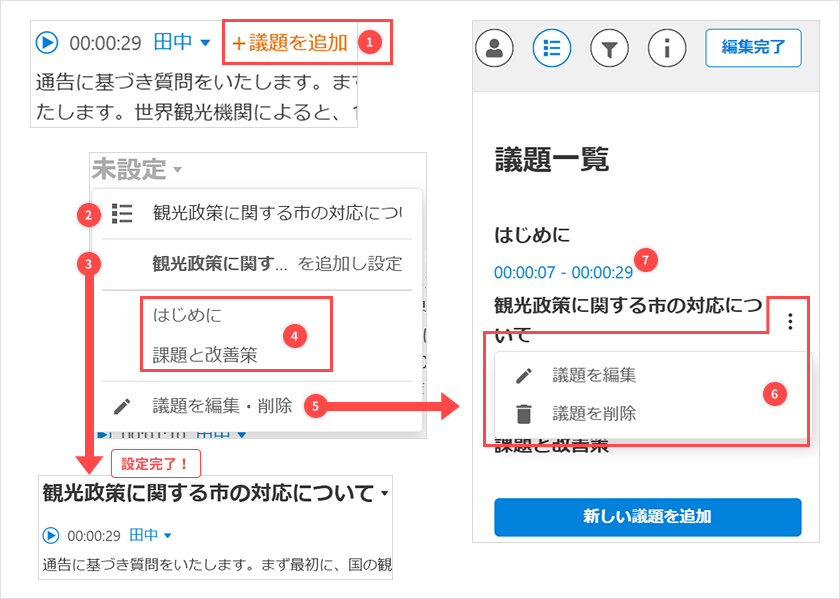 ※文字起こしエリアの編集時は、画面右上の「編集」ボタンを押して編集可能な状態にした上で操作し、完了時は「編集完了」ボタンを押してください。