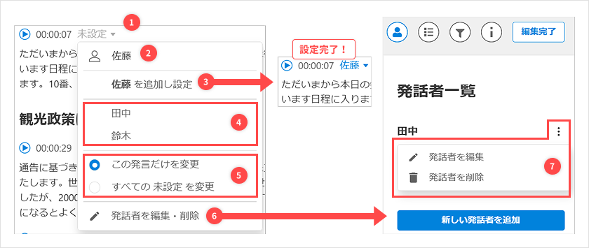 - 「発話者を編集・削除」をクリックすると発話者一覧メニューが表示されます。