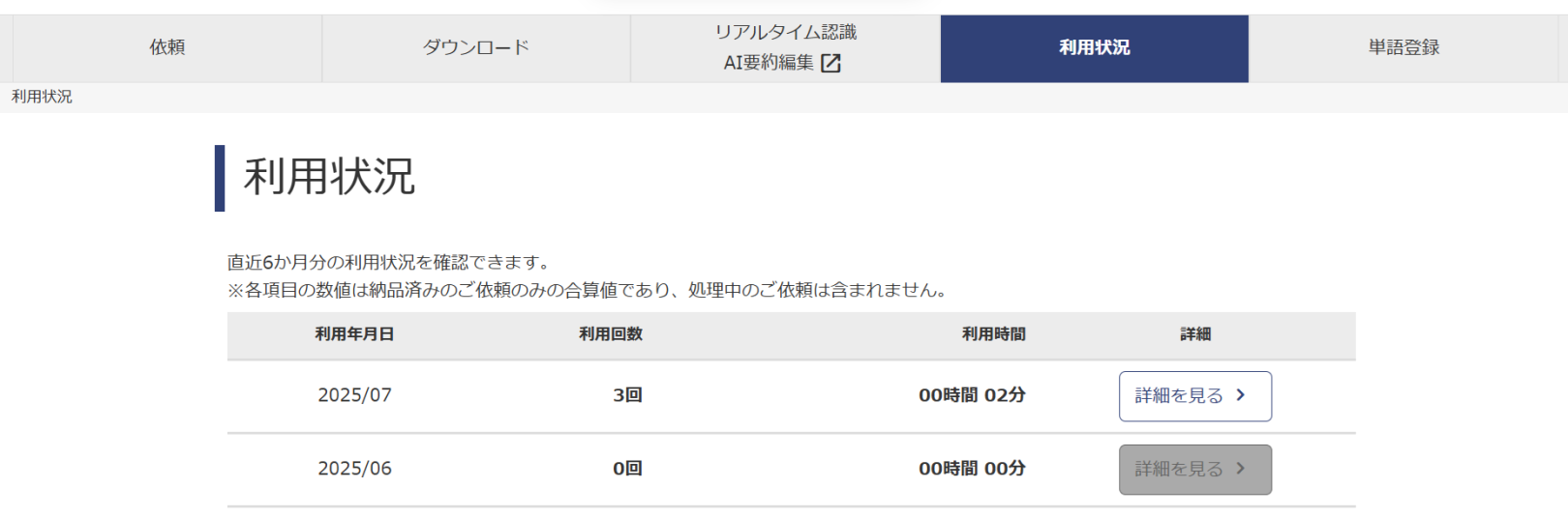 利用状況の一覧から当該月行の[詳細を見る]をクリックすると、当該月の利用履歴を確認することができます。