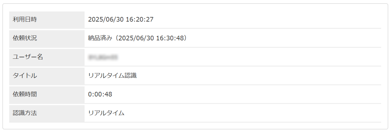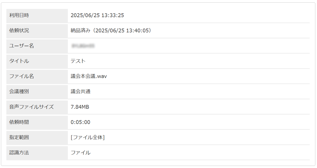 音声ファイル認識(セルフ依頼):認識処理が完了して依頼状況が「納品済み」になった