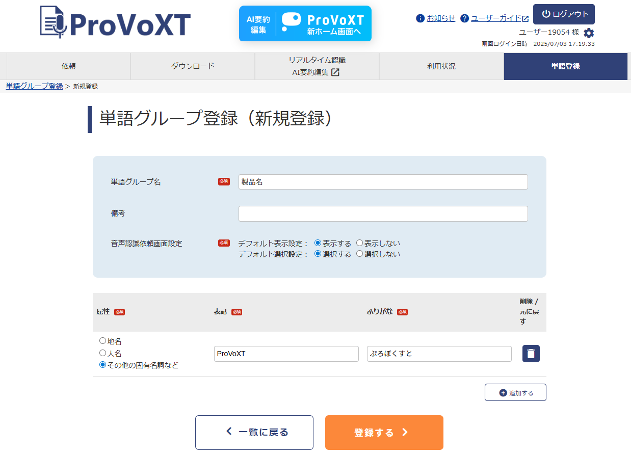 デフォルト選択設定:該当の単語グループを、選択状態または非選択状態にします。 - 登録したい単語の[属性]、[表記]、[ふりがな]を入力し[登録する]をクリックします。