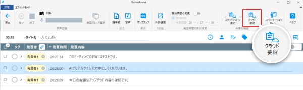 ステップ2で作成した会議データを選択し、メニューバーの[クラウド要約]ボタンをクリックします。