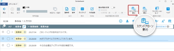 ライブラリ画面でステップ2で作成した会議データを開き、メニューバーに[スタンドアローン要約]をクリックしてください。
