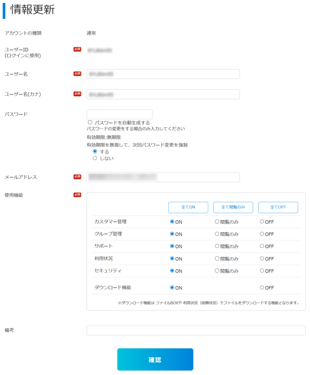※マスターアカウントは強制的に全ての機能が使用可能となります。