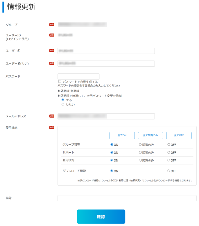入力後はページ最下部の[確認]ボタンをクリックし内容をご確認の上、[更新]ボタンをクリックしてください。