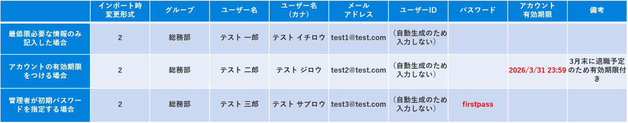 | アカウント有効期限 | ログインできる期限(空白時は無制限) 可能な入力形式:「2025-10-30 23:59」または「2025/10/30 23:59」 ※CSVファイルの開き方により日時表示の見え方が異なる場合があります。 |