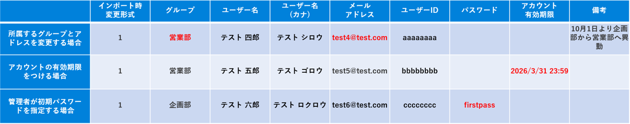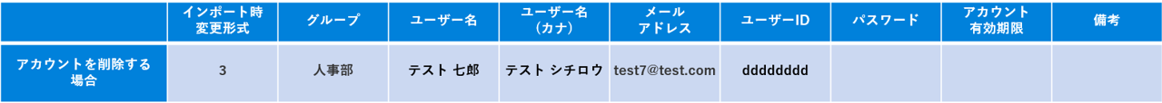 | インポート時変更形式 | 1~3のいずれかを入力 -1の場合、該当ユーザーアカウントを更新します -2の場合、該当ユーザーアカウントを追加します -3の場合、該当ユーザーアカウントを削除します ※インポート方法で[CSVファイルの内容を上書きする]を選択する場合は指定不要 |