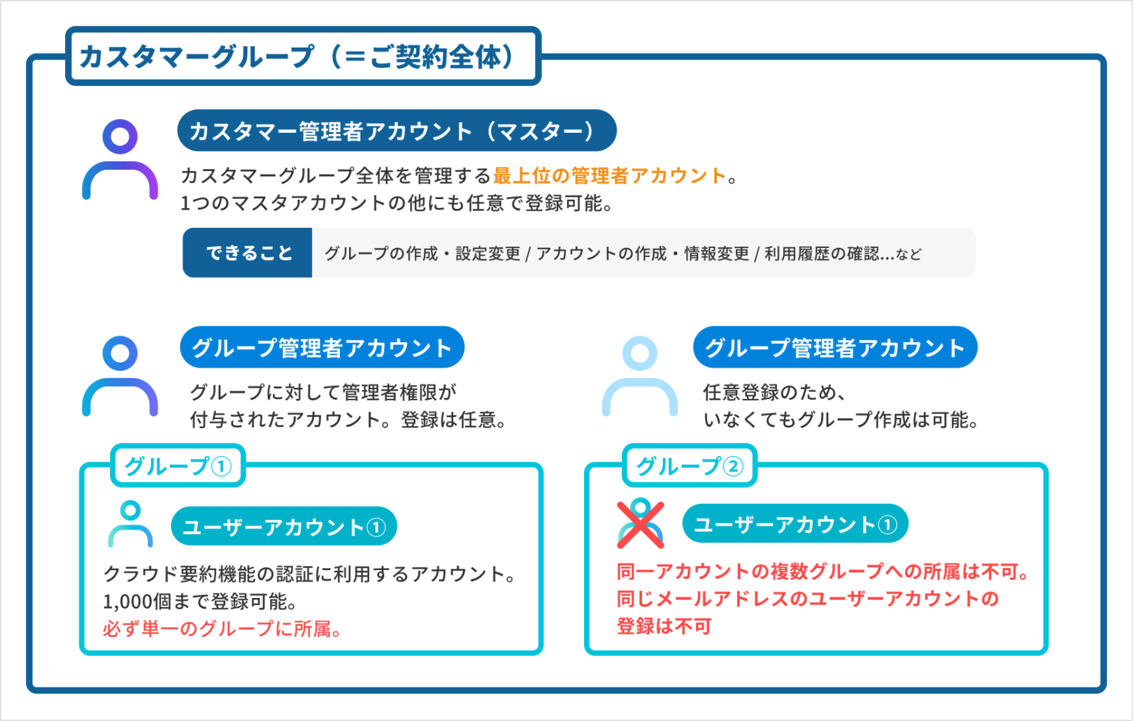 - カスタマーグループ全体を管理する最上位の管理者アカウント
