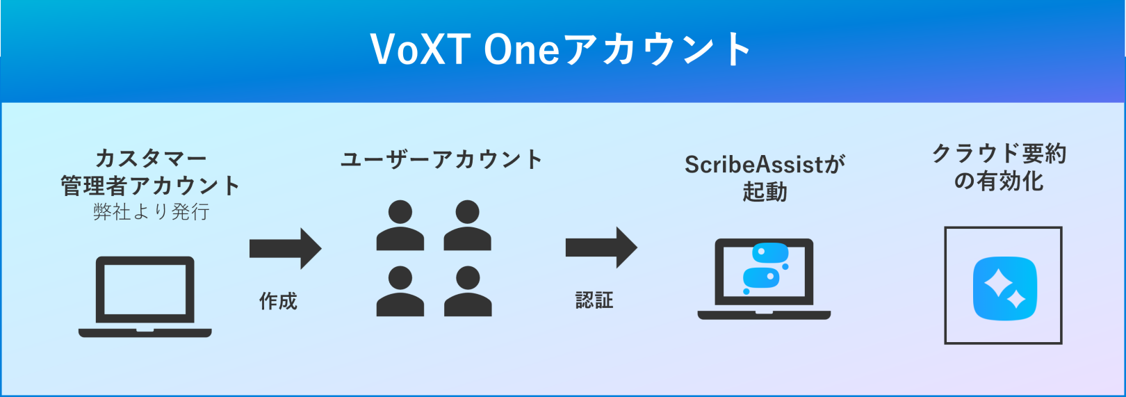 これまで、Customer IDにてScribeAssistの起動管理を実施しておりました。また、VoXT Oneアカウントはクラウド要約機能を有効化する際に必要でした。