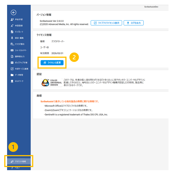バージョンアップしたScribeAssistを起動し、設定>アカウント情報>ライセンス変更から、ライセンス認証画面を開きます。
