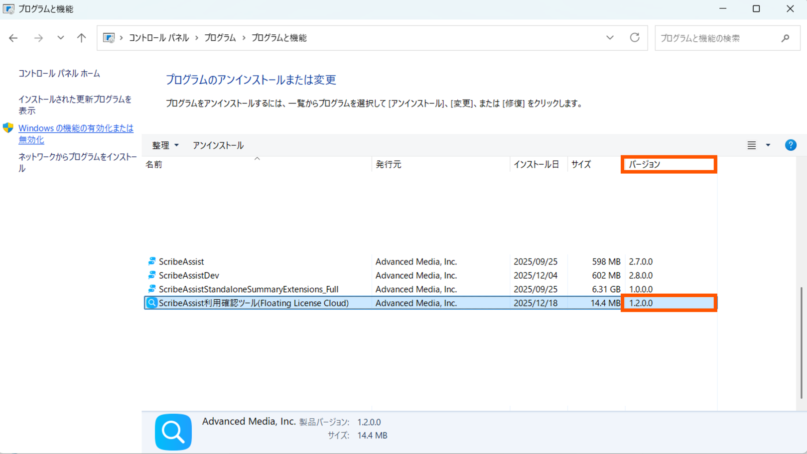 プログラム>プログラムと機能>ScribeAssist利用確認ツールを探してバージョン情報を確認しましょう。