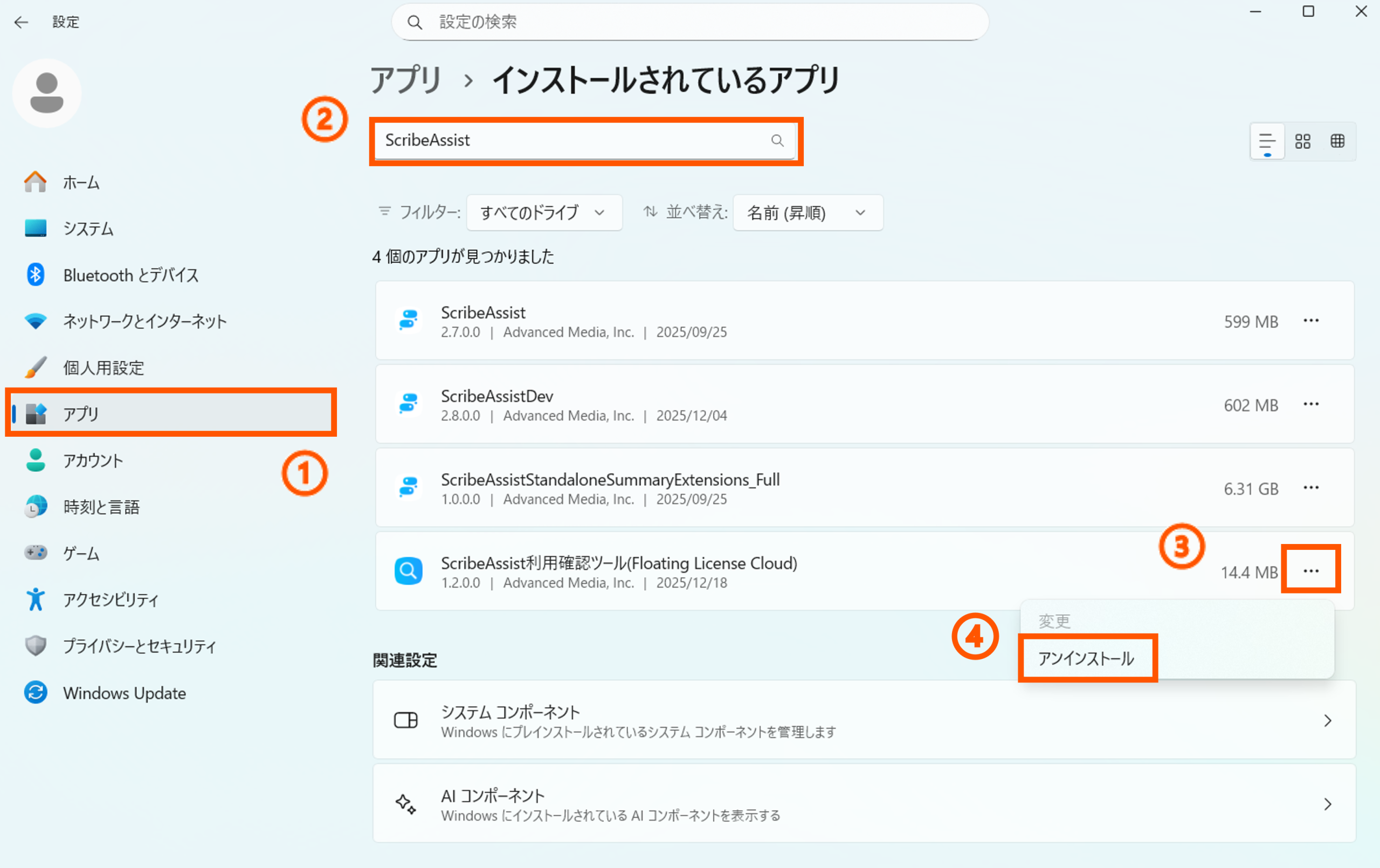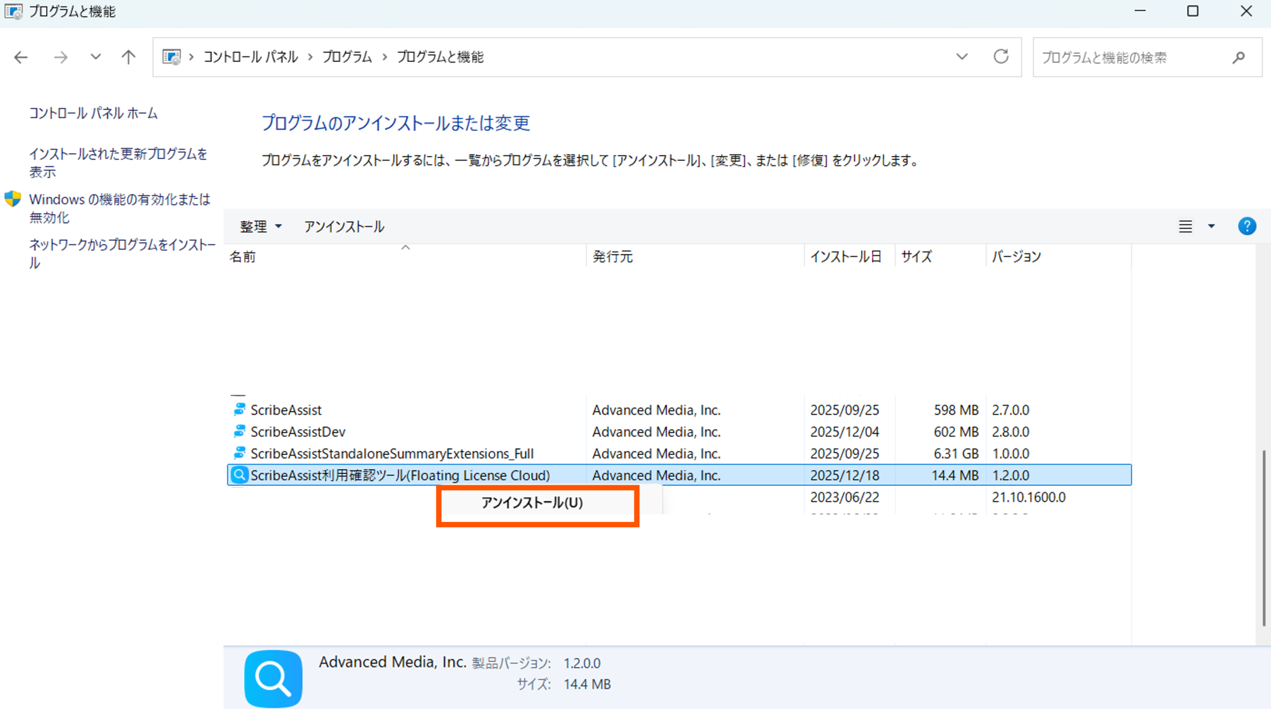 ②「ScribeAssist利用確認ツール」を右クリックし「アンインストール」を選択