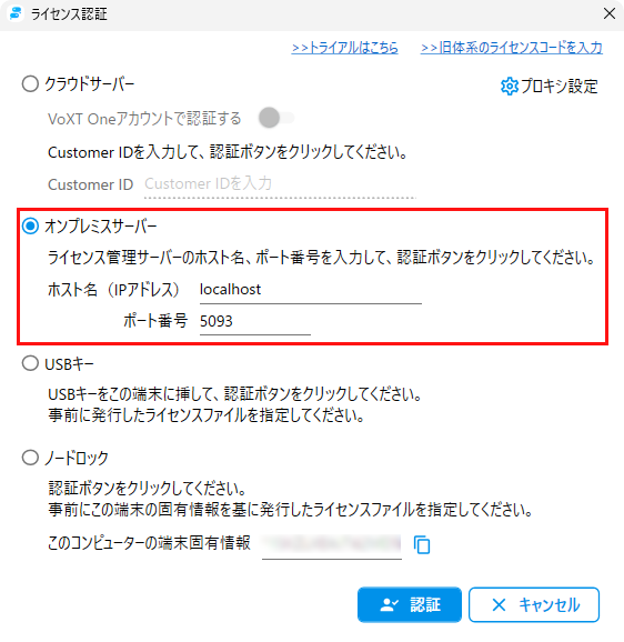 ②オンプレミスサーバーを選択し、ホスト名(IPアドレス)とポート番号を入力し、[認証]ボタンを押してください。