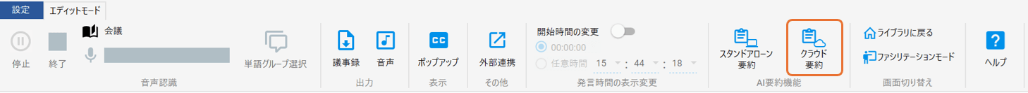 ライブラリ画面から要約したい音声認識データを開き、メニューバーにある[クラウド要約]ボタンをクリックします。