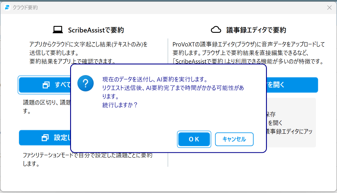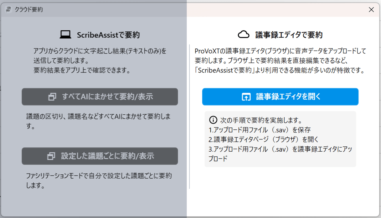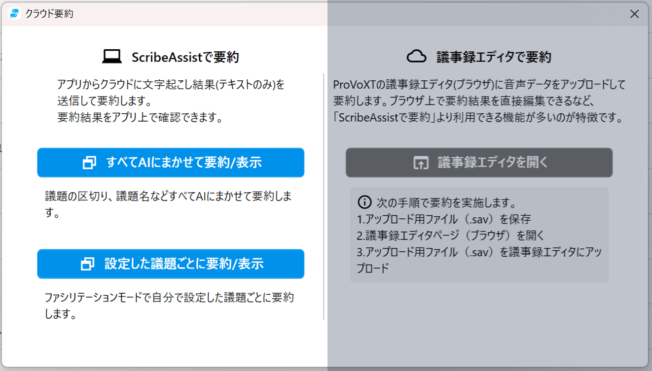 クラウド要約には「ScribeAssistで要約」と「議事録エディタで要約」の2つのモードがあります。