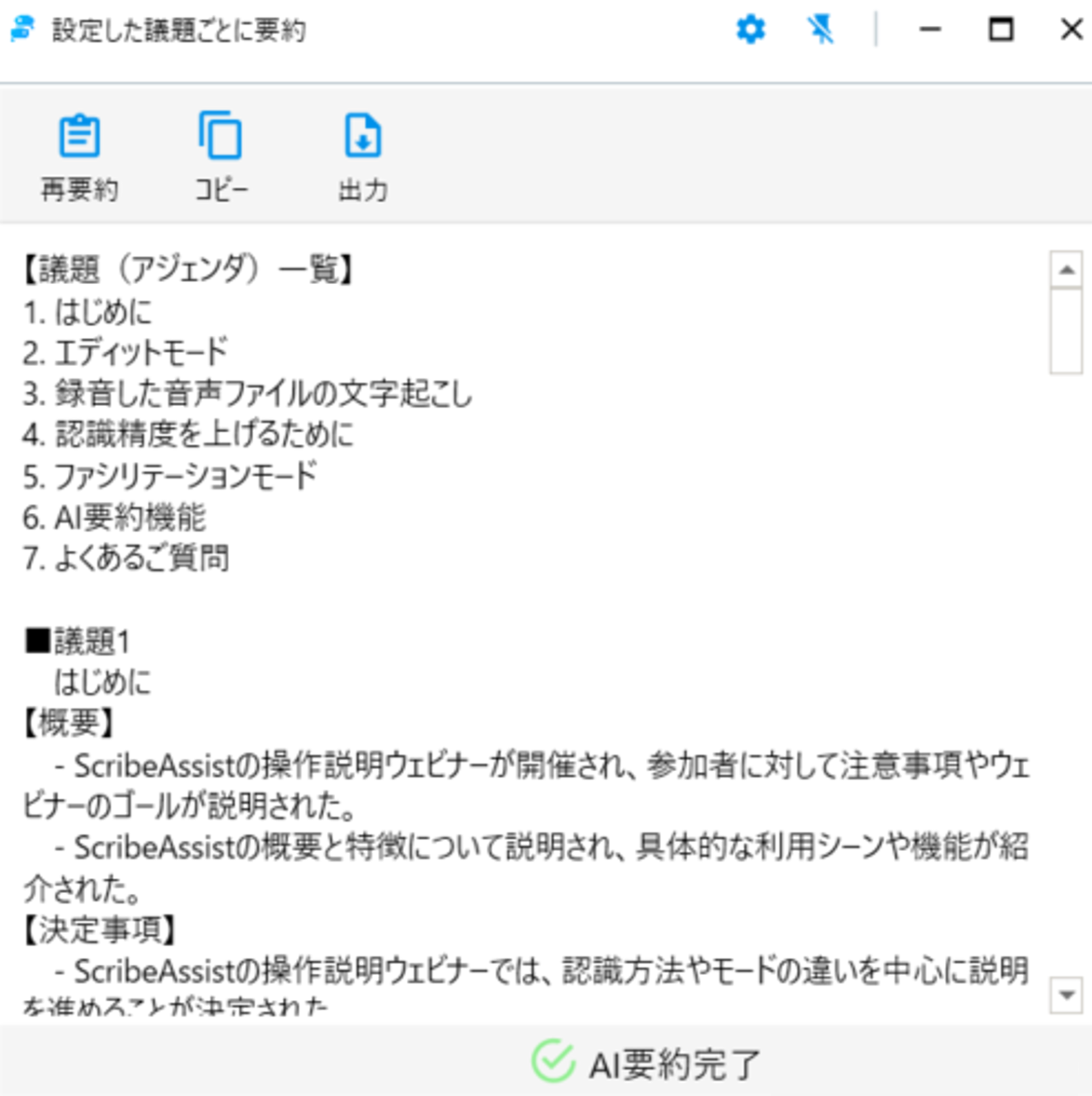 ※認識結果を修正し、再要約をしていただくことで要約精度の向上が見込めます。
