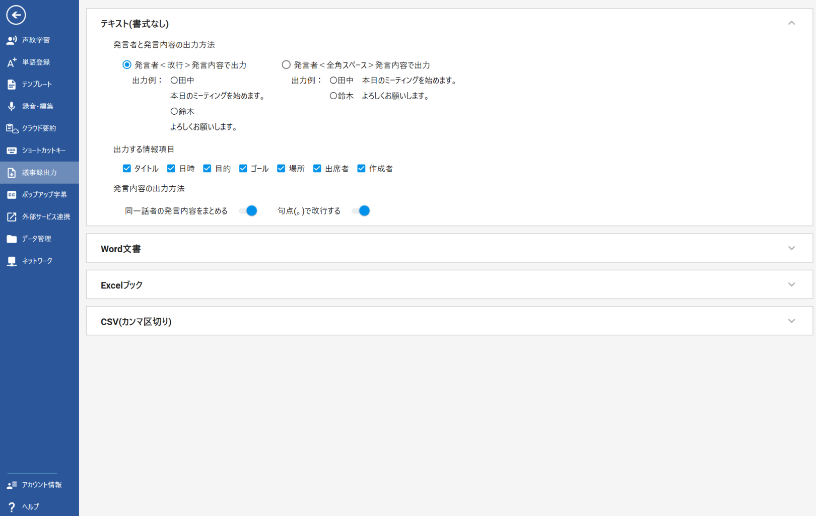 発言内容の出力方法 | 同一話者の発言内容をまとめる 異なる発言者が選択されている発言内容までを同一の発言者としてまとめて出力する方法です。 ※まとめたくない場合はOFFにしてください 句点(。)で改行する 発言内容の(。)で改行できます。 ※(。)で改行したくない場合はOFFにしてください。 |
