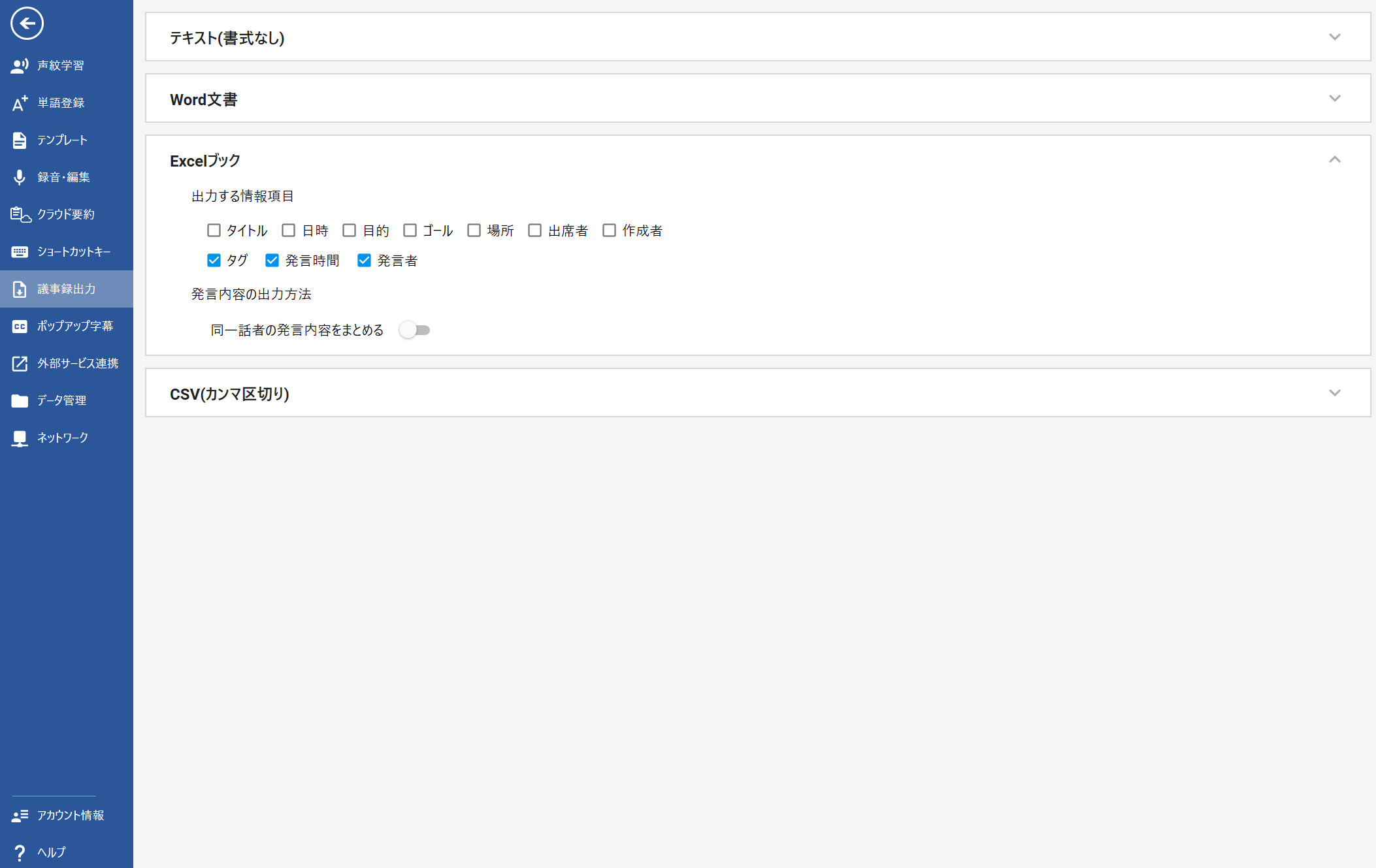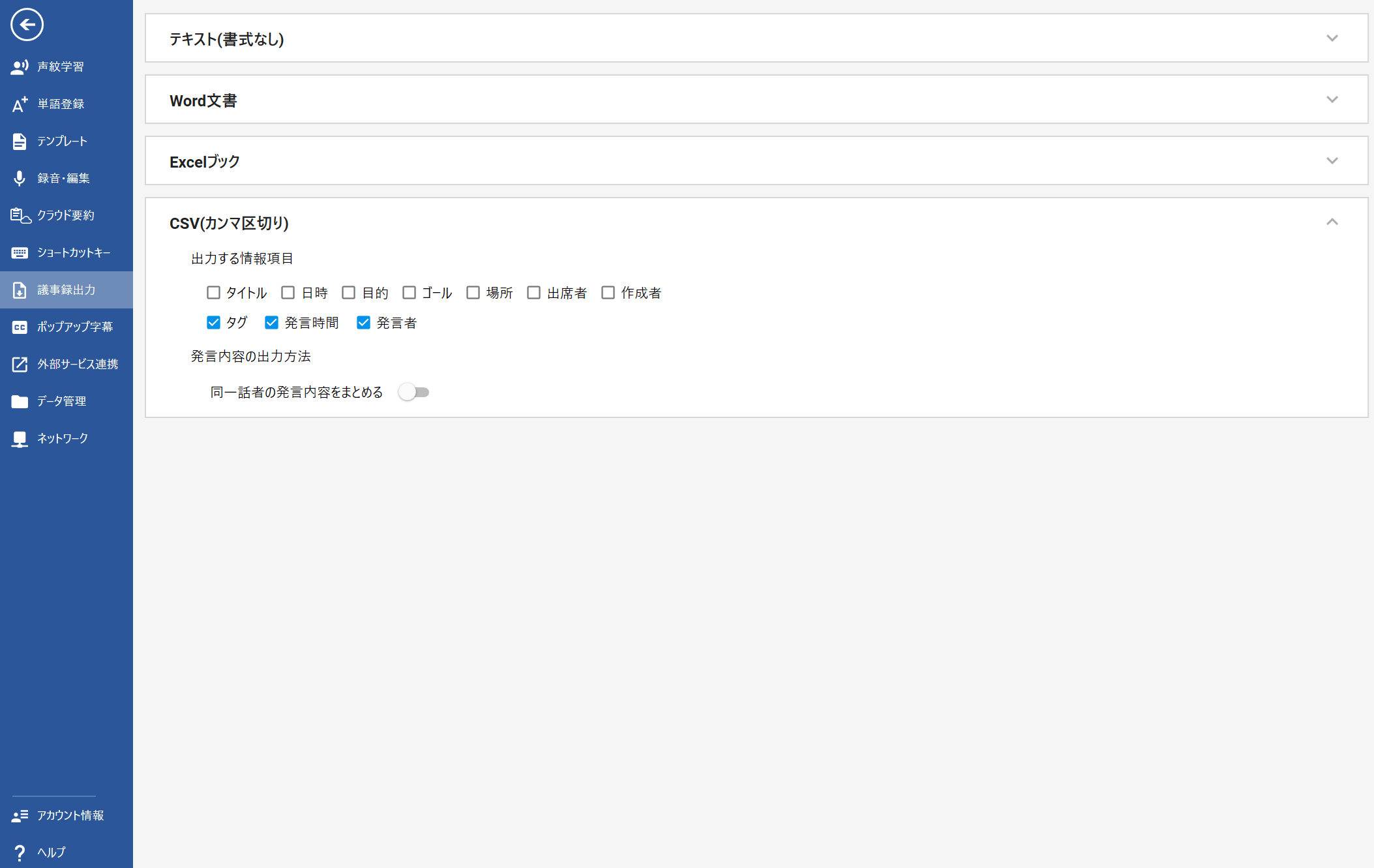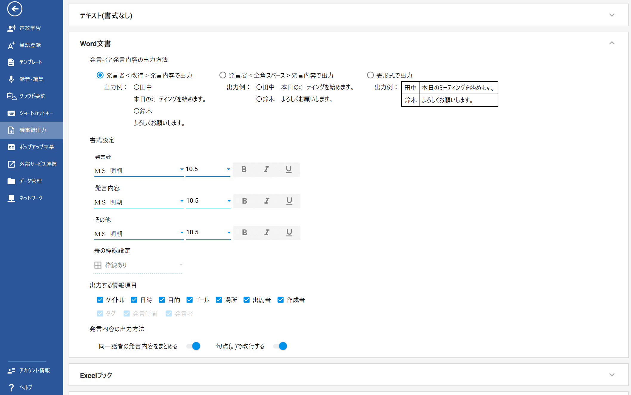 - [設定]画面左メニューにある[議事録出力]をクリックすると、設定画面が開きます。