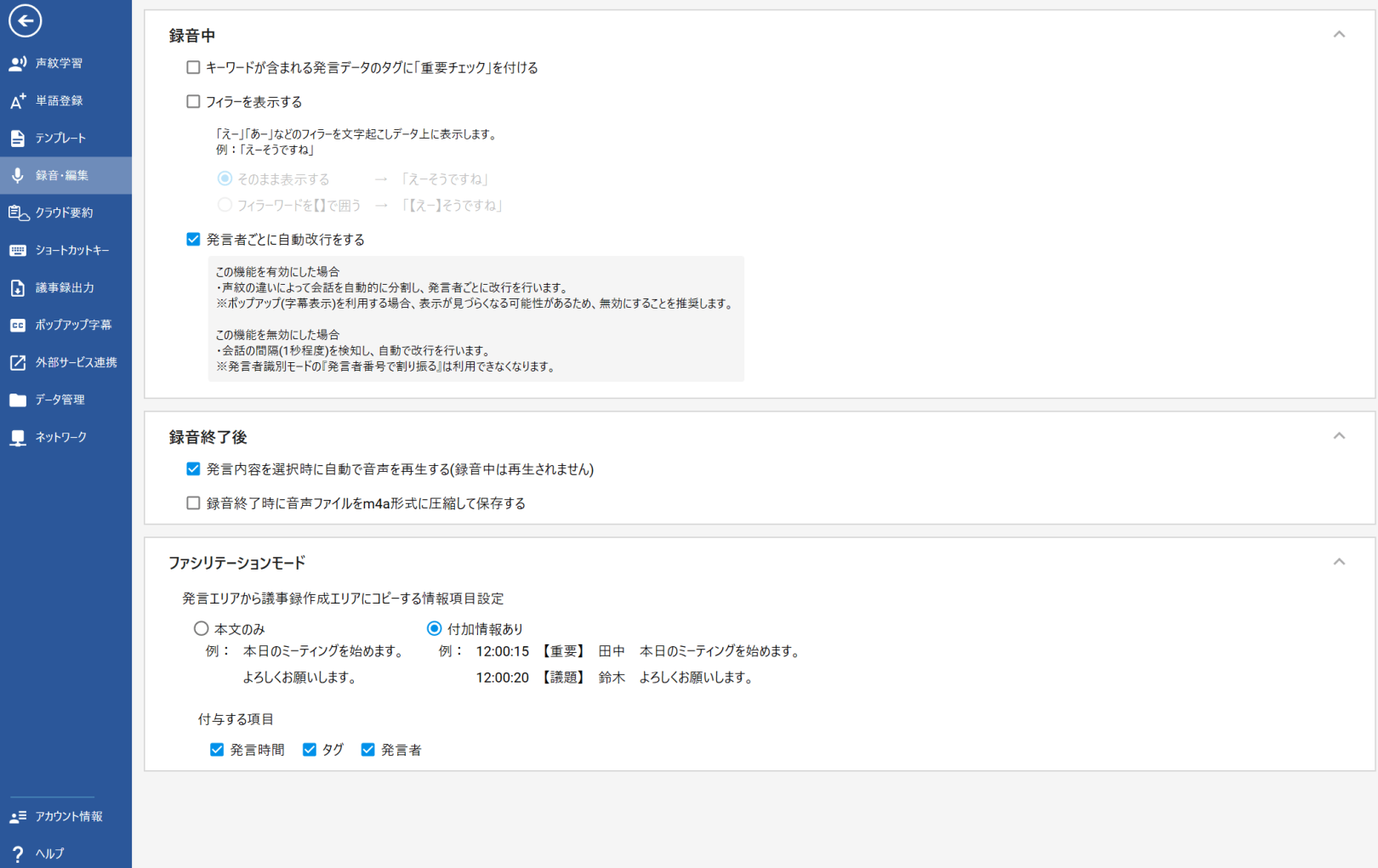 発言エリアから議事録作成エリアにコピーする情報項目設定