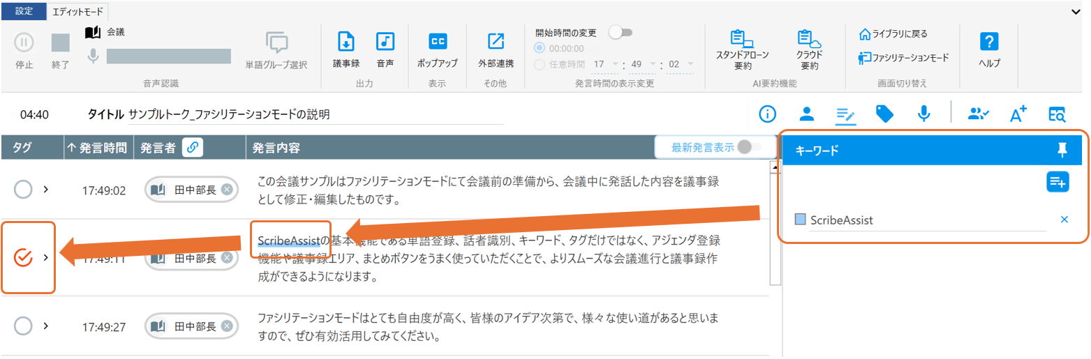 キーワードが含まれる音声データのタグに「重要チェック」を付ける