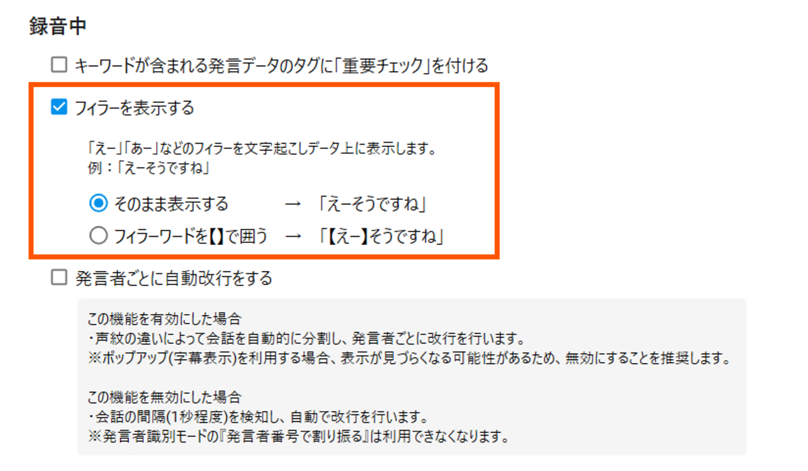 • フィラーワードを【】で囲う:フィラーとして認識されたワードを【】で囲って表示します。
