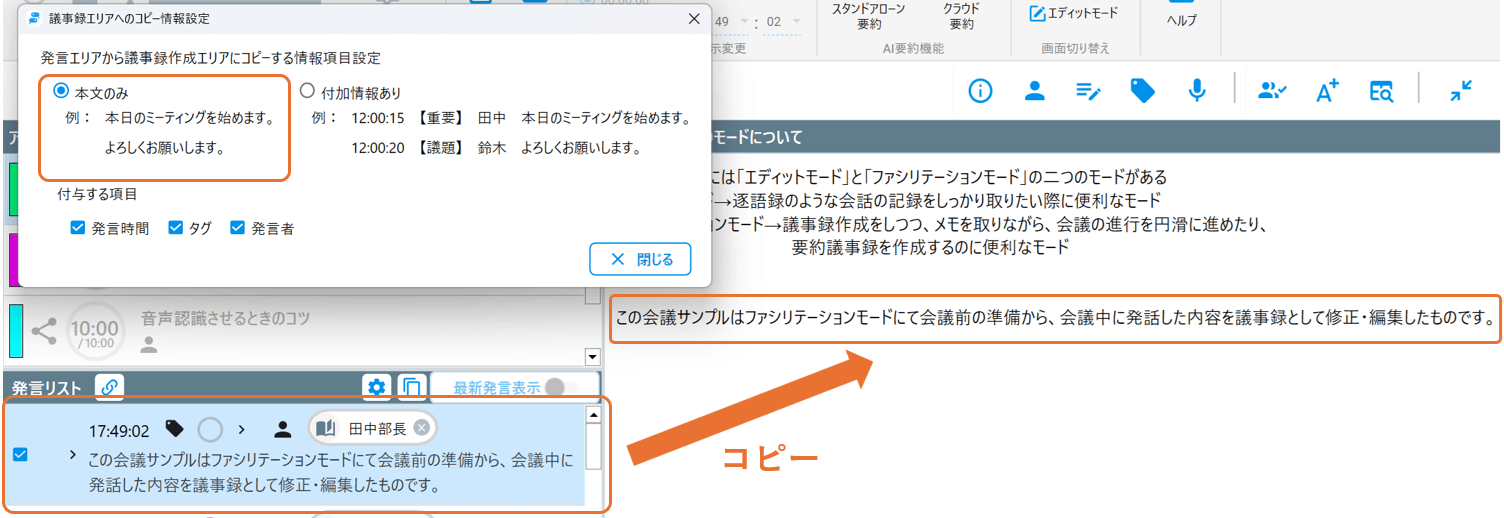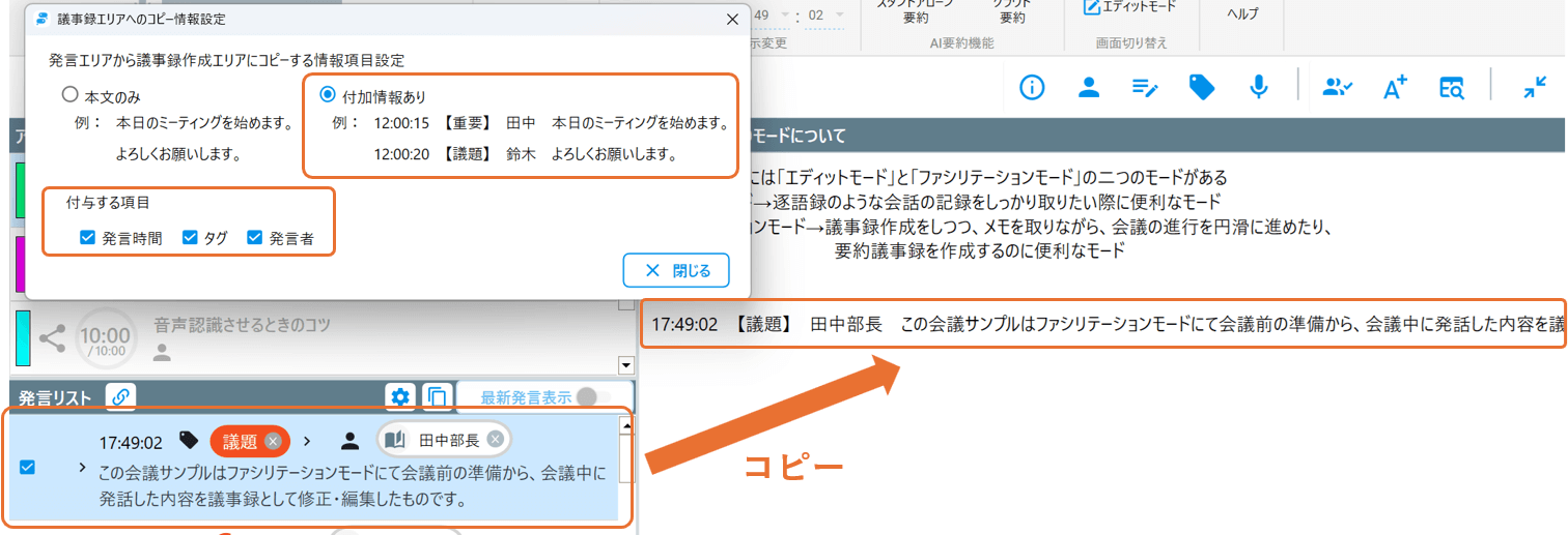 選択した発言リストの本文以外の情報を議事録作成エリアにコピーすることができます。