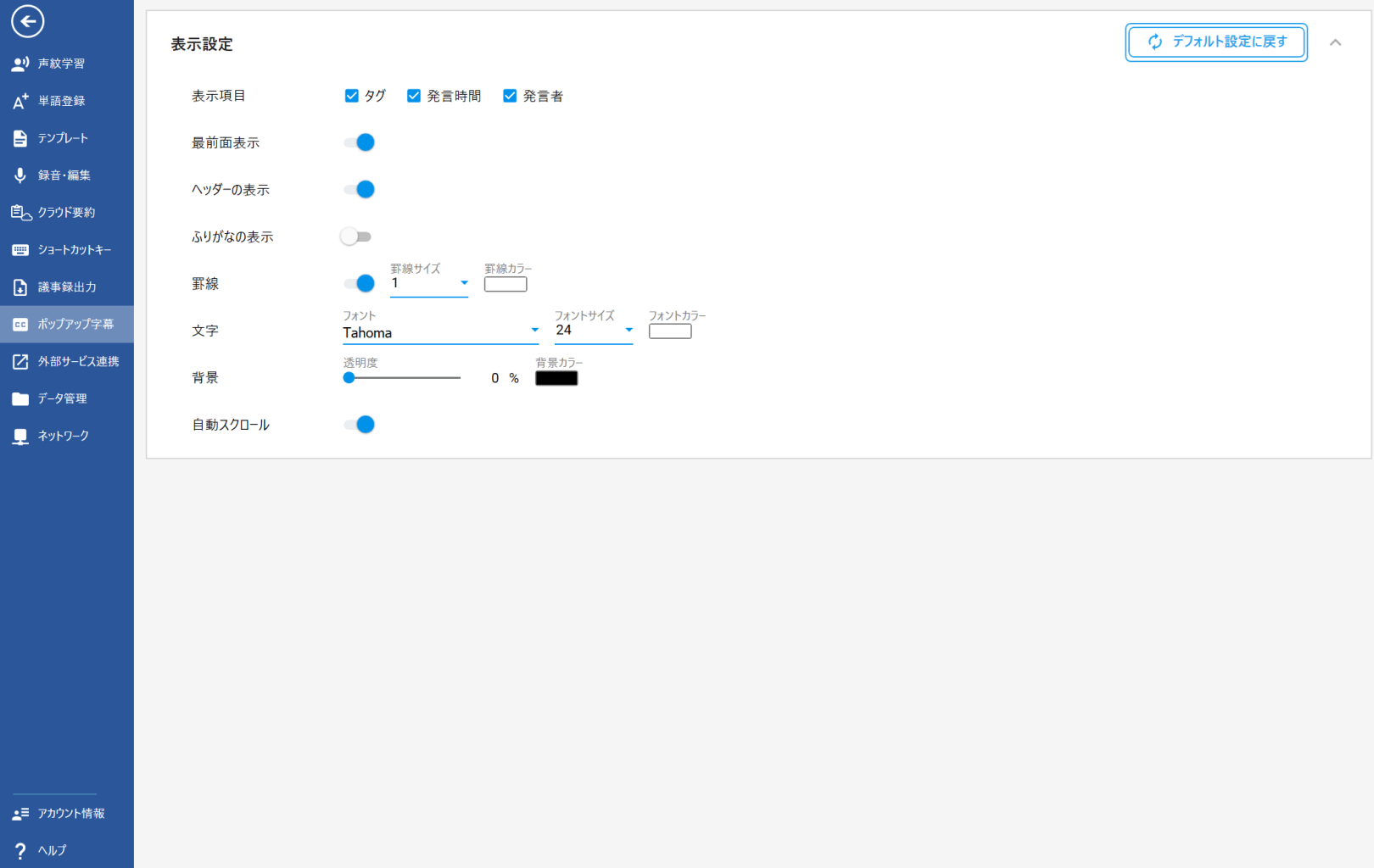 - [設定]画面左メニューにある[ポップアップ字幕]をクリックすると、設定画面が開きます。