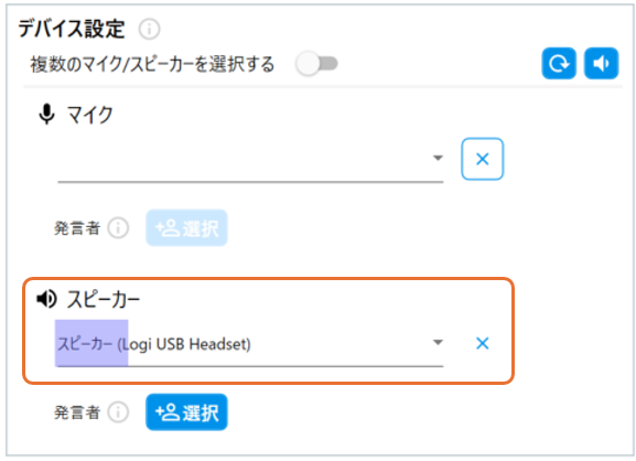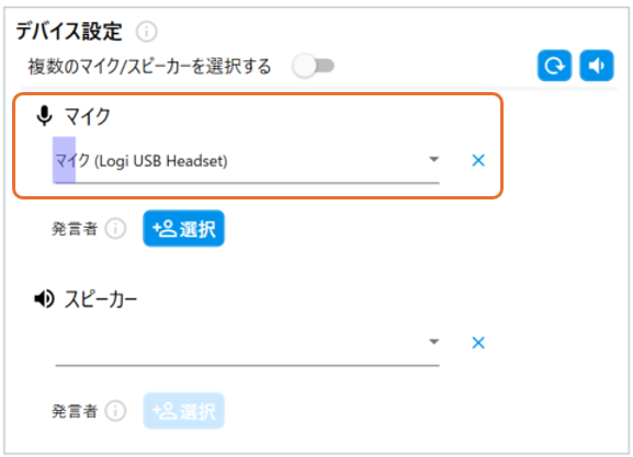 Web会議で、自身は発言しない等で相手側の音声のみを文字起こししたい場合、マイクの選択は不要です。スピーカーのみ選択してください。
