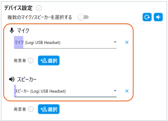 Web会議で、相手側の音声に加え、自分の音声や会議室の音声を文字起こししたい場合、マイクとスピーカーをそれぞれ選択ください。