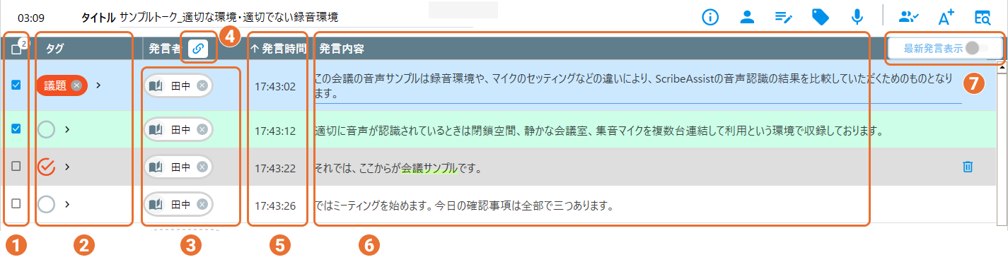 ①複数選択発言内容を複数選択することができます。複数選択した発言に対して、一括して削除・タグ付け・発言者の選択等が行えます。
