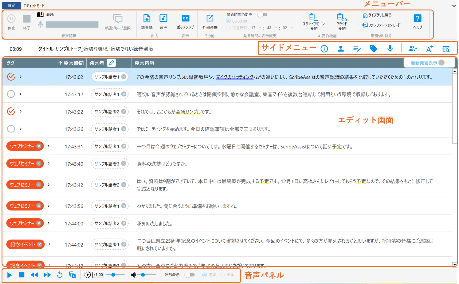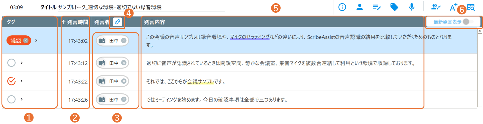③発言者 | 発言者識別によって識別された発言者が表示されます。 発言者識別の詳細についてはこちらをご確認ください。 |