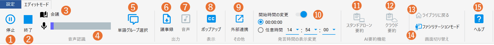 ⑩開始時間の変更 | 開始時間の変更ができます。 ONにすることで変更が可能になります。 OFFにすると初期値の時間表示に戻ります。 00:00:00 経過時間で表示します 任意時間 指定の時間を最初の発言として表示します ※初期値は認識開始時の時間となります。 |