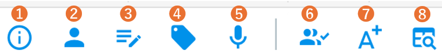 ①再生・一時停止 ボタン | 音声停止中は、再生ボタンが表示されます。 再生ボタンをクリックするとフォーカスがあった発言内容の音声が再生され、ボタンが一時停止ボタンに変わります。 音声再生中に一時停止ボタンをクリックすると、音声再生が停止し、ボタンが再生ボタンに変わります。 一時停止状態から再生ボタンをクリックすると、停止箇所から音声再生が再開します。 |