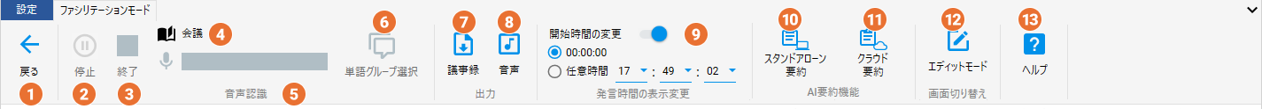 | ④音声認識辞書 | 録音前設定または音声ファイル前設定で選択した音声認識辞書が表示されます。 ※ファシリテーションモード画面では音声認識辞書の変更はできません。 |