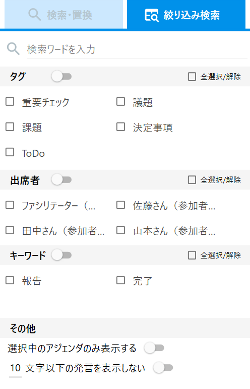 ファシリテーションモードで選択中のアジェンダのみ絞り込んで表示することができます。スイッチボタンで検索の有効無効を選択できます。(青色が有効)